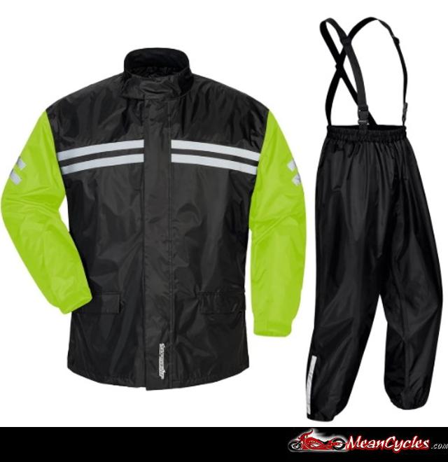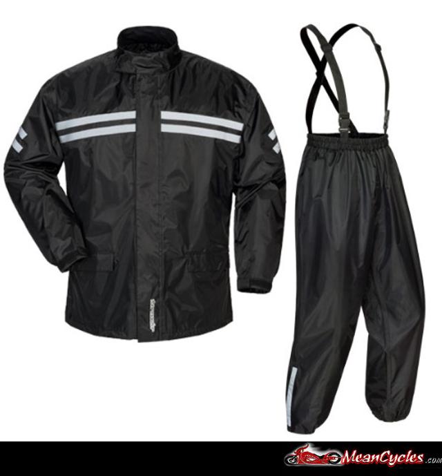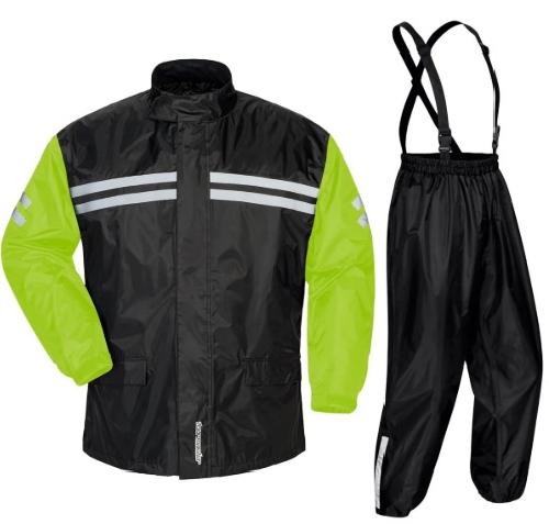 Reflective tape across the chest, back, and upper arms of jacket and cuffs of pants
