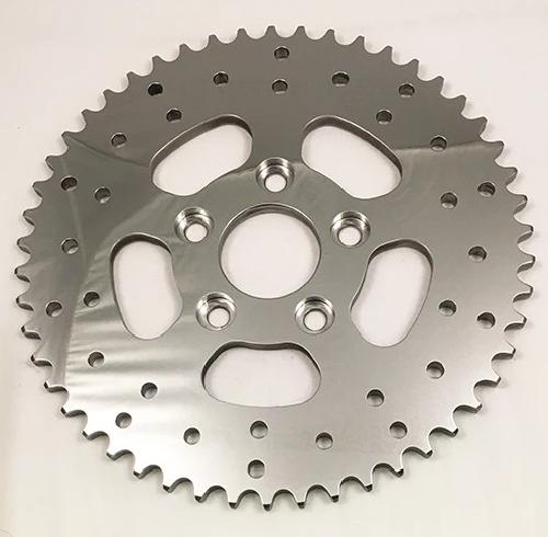 These are the sprocket/rotors used in our Sprocket Brake Kits. They are available in 48T (9.8" diameter) or 50T (10.2" diameter) options. If you are ordering this as a replacement for your existing sprocket/rotor then you must order the same tooth count as the calipers are not interchangeable (because caliper mounting arm length matches sprocket diameter). These are made from hardened stainless steel and measure 0.35" thick. The 50T sprockets are supplied with the 'later model' 2.215" center hole, plus a sleeve to convert to 'evolution-era' 1.98" center-hole. The 48T sprockets are only available with 'evolution-era' 1.98" center-hole but the center-hole can be bored to your specified dimension for $50 additional charge (contact us directly for this option). If you are replacing an early sprocket/rotor that had countersunk mounting holes, then you will also need to order new mounting hardware (ARP) as these new sprocket/rotors are counter-BORED.