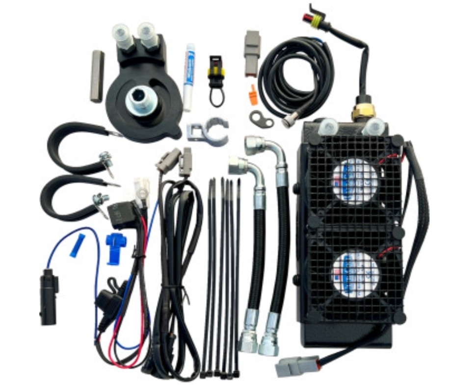 Oil Adapter and Thermal Switch with waterproof connectors automatically turns on the powerful dual fans when oil reaches 210°F